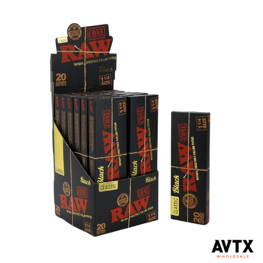 Raw Black Organic Cones 1-1/4 Size Display 12 Packs of 20